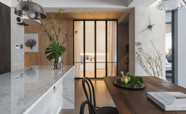 ▲在餐厅的左侧,设计师以玻璃推拉门为好客的主人打造了一个会客室,主人可以隔三差五邀请朋友过来聚会。